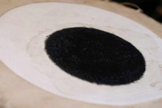 皮の土台が完成したら、真ん中の黒い部分、シャヒィの制作です。 バラナシのシャヒィは、鉄粉(または石粉)とチャパティを混ぜて作ります。 カルカッタではチャパティの代わりに米を使います。