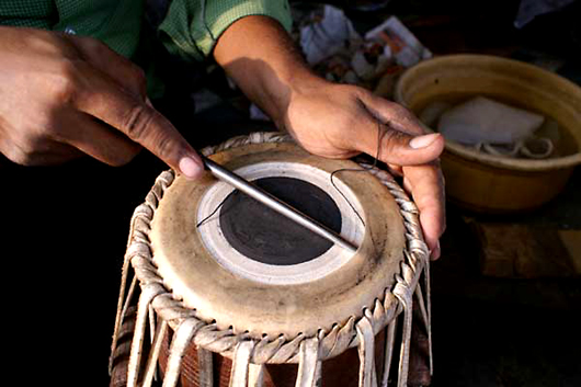 チャーティーとラウの間に綿糸を入れて微妙な空間を作ります。 これで音の伸びが格段に良くなります。 皮の表面の汚れた部分を、ヤスリ掛けしてきれいにします。 チューニングをしたら完成。